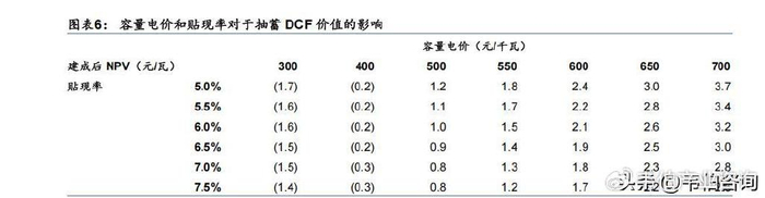图表:容量电价和贴现率对于抽蓄DCF价值的影响