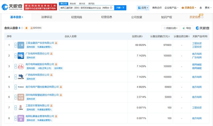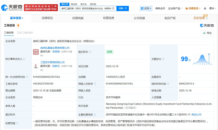 雷达财经讯,天眼查App显示,12月16日,南网工融双碳(深圳)股权投资基金合伙企业(有限合伙)成立,执行事务合伙人为南网私募基金管理有限公司、工银资本管理有限公司,出资额140亿人民币,经营范围为以私募基金从事股权投资、投资管理、资产管理等活动,由工银金融资产投资有限公司、南网储能(600995)、 广东电网有限责任公司等共同出资。