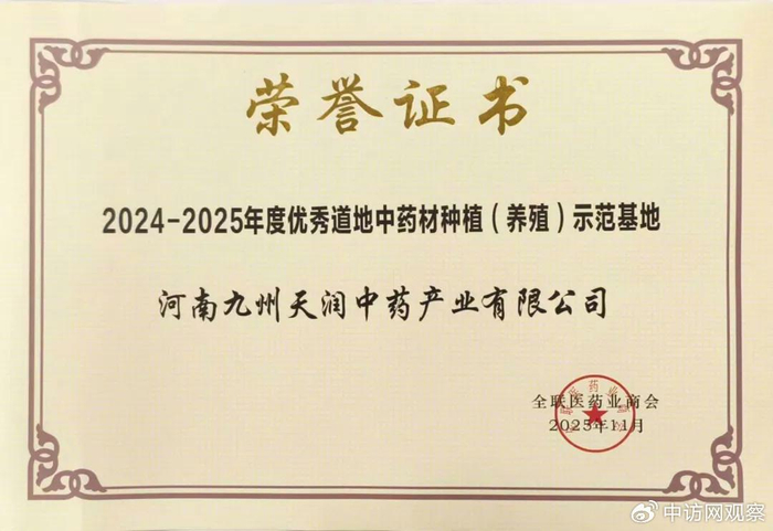 11月10日,由全国工商联医药业商会主办的第四届泰山医药论坛暨2024-2025年度医药行业信息发布会在济南成功举办。九州通九信中药一举斩获“医药工业营业收入百家企业”“医药行业增长率前五十家企业”“医药行业守法诚信企业”荣誉,旗下黄冈金贵中药产业发展发展有限公司、金寨九信中药饮片有限公司、河南九州天润中药产业有限公司均荣获“2024-2025年度优秀道地中药材种植(养殖)示范基地”,充分展现了九信中药在全产业链布局与道地药材源头把控方面的优势。