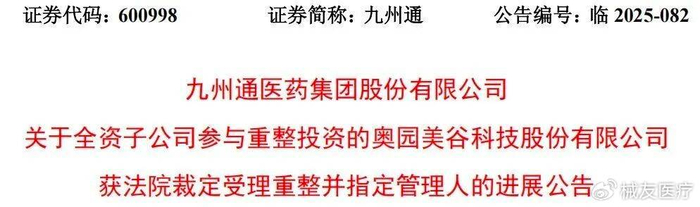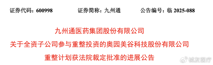 医药流通领域的“王者”九州通,正式入主了身陷重整危机的医美巨头奥园美谷。
