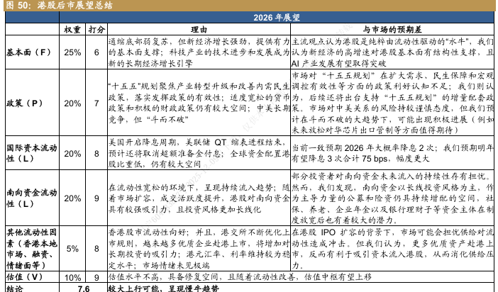 流动性:外资预计美联储2026年将降息3次(共75bps),结束QT缩表,全球资金回流新兴市场可期;南向资金:以公募、险资为主的长线资金持续净流入,未来增量空间巨大,成为港股市场稳定器。