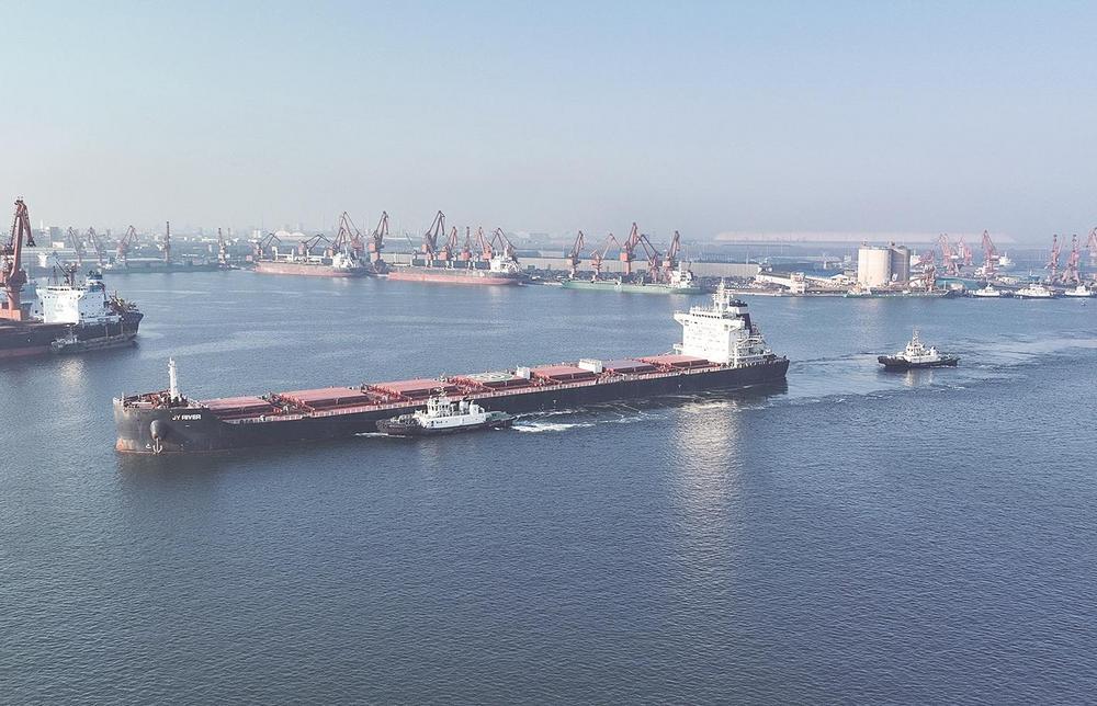 7月19日,一艘轮船在拖轮协助下驶入唐山港京唐港区港池(无人机照片)。