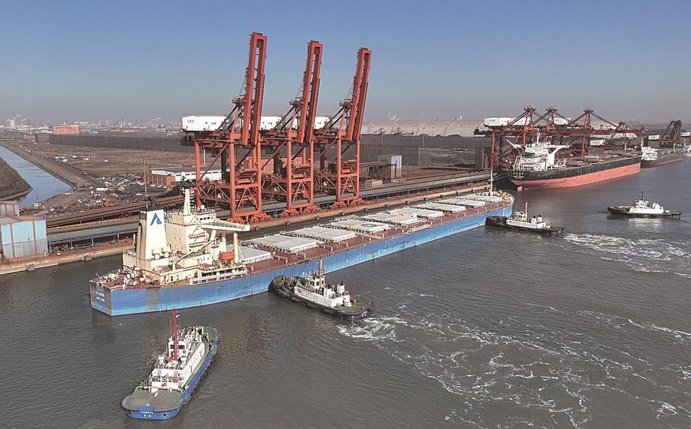 1月15日,一艘轮船在拖轮的协助下向唐山港京唐港区煤炭码头靠泊(无人机照片)。