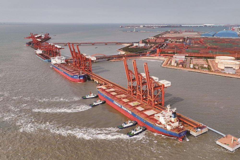 10月16日,多艘轮船靠泊在唐山港曹妃甸港区矿石码头卸载(无人机照片)。