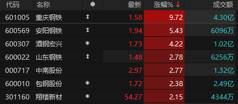 钢铁板块异动拉升 重庆钢铁涨超9%