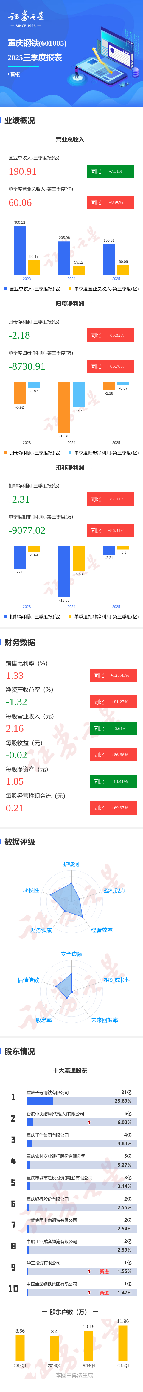 证券之星消息,重庆钢铁2025年三季报显示,前三季度公司主营收入190.91亿元,同比下降7.32%;归母净利润-2.18亿元,同比上升83.82%;扣非净利润-2.31亿元,同比上升82.92%;其中2025年第三季度,公司单季度主营收入60.06亿元,同比上升8.96%;单季度归母净利润-8730.91万元,同比上升86.78%;单季度扣非净利润-9077.02万元,同比上升86.31%;负债率53.22%,投资收益135.97万元,财务费用1.21亿元,毛利率1.33%。