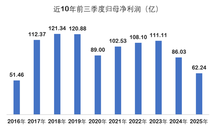虽然前三季度及三季度单季营收均同比有所增长,但净利润表现确实难言乐观。上一次前三季度这个体量的利润规模还要追溯到2016年,前三季度净利润跌幅也创下近十年来最大降幅。