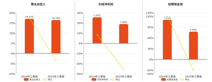 公司营业总收入为18.70亿元,在已披露的同业公司中排名第27,较去年同报告期营业总收入减少6682.83万元,同比较去年同期下降3.45%。归母净利润为1.06亿元,在已披露的同业公司中排名第29,较去年同报告期归母净利润减少3710.94万元,同比较去年同期下降25.90%。经营活动现金净流入为5.04亿元,在已披露的同业公司中排名第26,较去年同报告期经营活动现金净流入减少2.17亿元,同比较去年同期下降30.07%。
