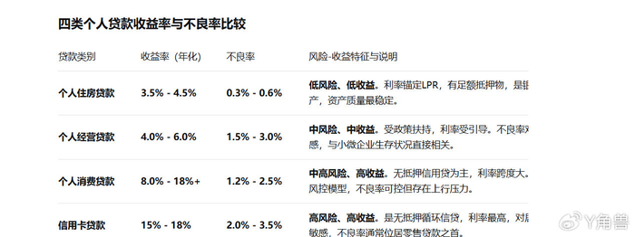 DS基于2023年年报、2024年半年报以及行业公开报告(如中国人民银行、国家金融监督管理总局发布的数据)中的典型值进行整理,旨在展示这四类贷款在年化收益率和不良率上的显著差异及其排序。