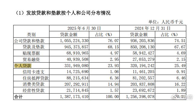 再如杭州银行的2025年6月末的个人贷款余额较2024年年末下降了2.12%,利息收入由62.66亿元,下降至55.86亿元。