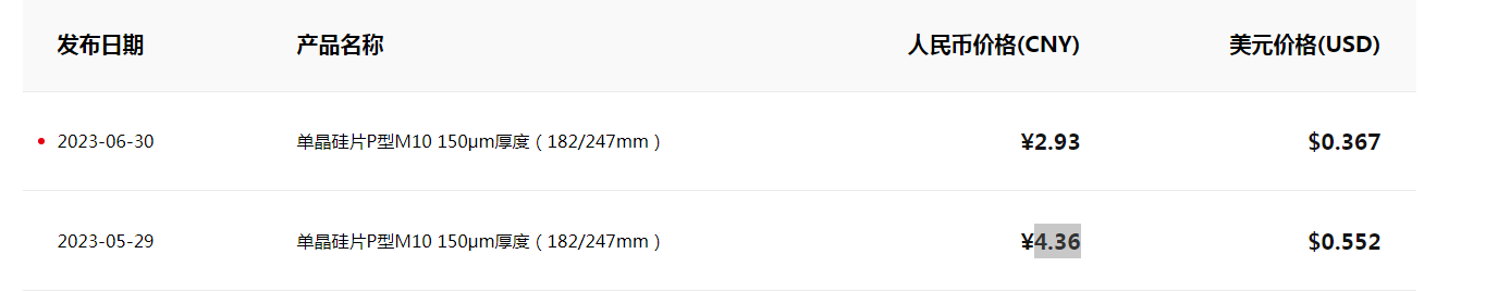 官网6月30日发布6月单晶硅片价格公示,“单晶硅片P型M10 150μm厚度”价格由4.36元人民币下调至2.93元,降幅32.8%。