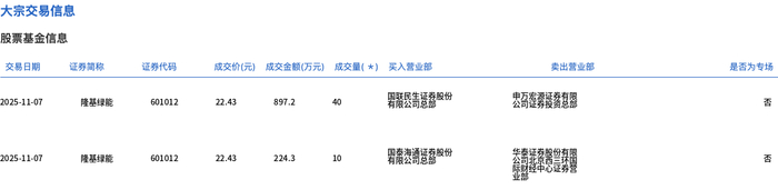 11月7日,隆基绿能大宗交易成交50万股,成交额1121.5万元,占当日总成交额的0.12%,成交价22.43元,较市场收盘价22.43元持平。