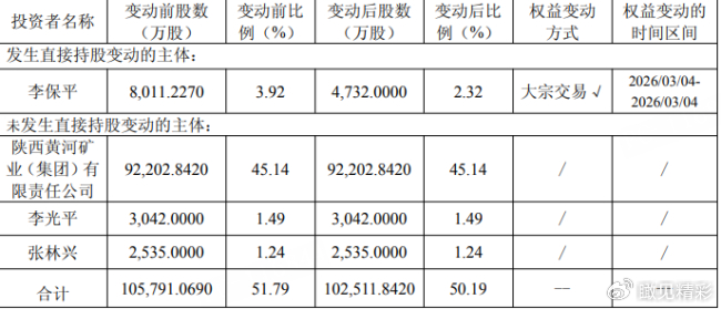从一致行动人持股结构来看,除李保平持股变动外,陕西黄河矿业集团仍持有9.22亿股,占比45.14%;李光平持有3042万股,占比1.49%;张林兴持有2535万股。四方合计持股比例降至50.19%。公司方面在公告中明确表示,本次权益变动不触及要约收购,不会导致公司控股股东、实际控制人发生变化,也不会对公司治理结构及持续经营产生重大影响。