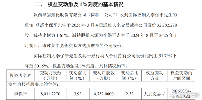 3月4日,陕西黑猫公告称,公司实控人李保平3月4日通过大宗交易方式减持公司股份3279.27万股,减持比例达1.61%。公开资料显示,李保平是陕西黑猫创始人,曾长期担任公司董事长。