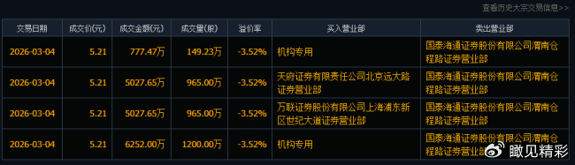 同花顺数据显示,3月4日陕西黑猫大宗交易约3279万股,成交金额总计17084万元。具体来看,本次大宗交易共发生4笔成交,成交价格均为5.21元/股,较当日收盘价5.40元折价约3.52%,买方包含机构专用席位,共买入1349.23万股,成交额7029.47万元。