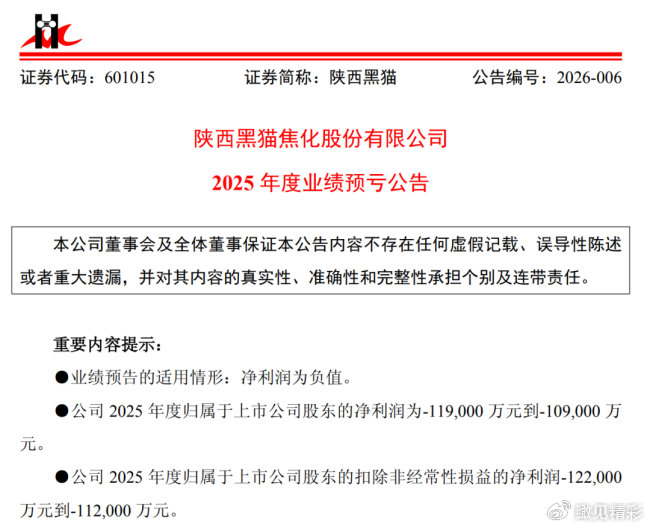 1月14日,陕西黑猫披露2025年度业绩预亏公告,预计2025年度归属于上市公司股东的净利润为-11.90亿元至-10.90亿元,归属于上市公司股东的扣除非经常性损益的净利润为-12.20亿元至-11.20亿元,业绩仍处于亏损状态,这也意味着公司2024年至2025年两年累计亏损预计将超22亿元。