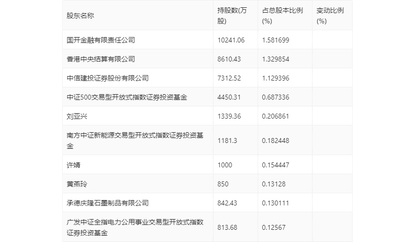 一季报显示,2024年一季度末公司十大流通股东中,持股最多的为国开金融有限责任公司,占比1.58%。十大流通股东名单相比2023年年报维持不变。在具体持股比例上,中信建投证券股份有限公司、中证500交易型开放式指数证券投资基金、南方中证新能源交易型开放式指数证券投资基金持股有所上升,国开金融有限责任公司、香港中央结算有限公司、许婧、黄燕玲、广发中证全指电力公用事业交易型开放式指数证券投资基金持股有所下降。
