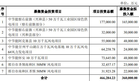 本次发行拟募集资金总额(含发行费用)不超过360,000.00万元,扣除发行费用后的募集资金净额拟用于投资中节能察右前旗(兴和县)50万千瓦工业园区绿色供电项目(察右前旗部分)、中节能察右前旗(兴和县)50万千瓦工业园区绿色供电项目(兴和县部分)、中节能阿克塞县10万千瓦风电项目、中节能甘州平山湖百万千瓦风电基地10万千瓦风电6#风力发电项目、中节能怀安10万千瓦项目、邢台市圣领南和区50MW风电项目、邢台市南和区圣领50MW风电项目。
