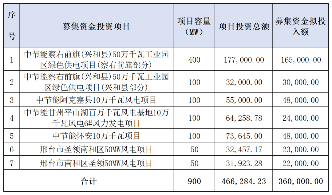 本次发行拟募集资金总额(含发行费用)不超过360,000万元,扣除发行费用后的募集资金净额拟用于投资7个风电项目。据风芒能源梳理,以下7个风电项目容量共计900MW。