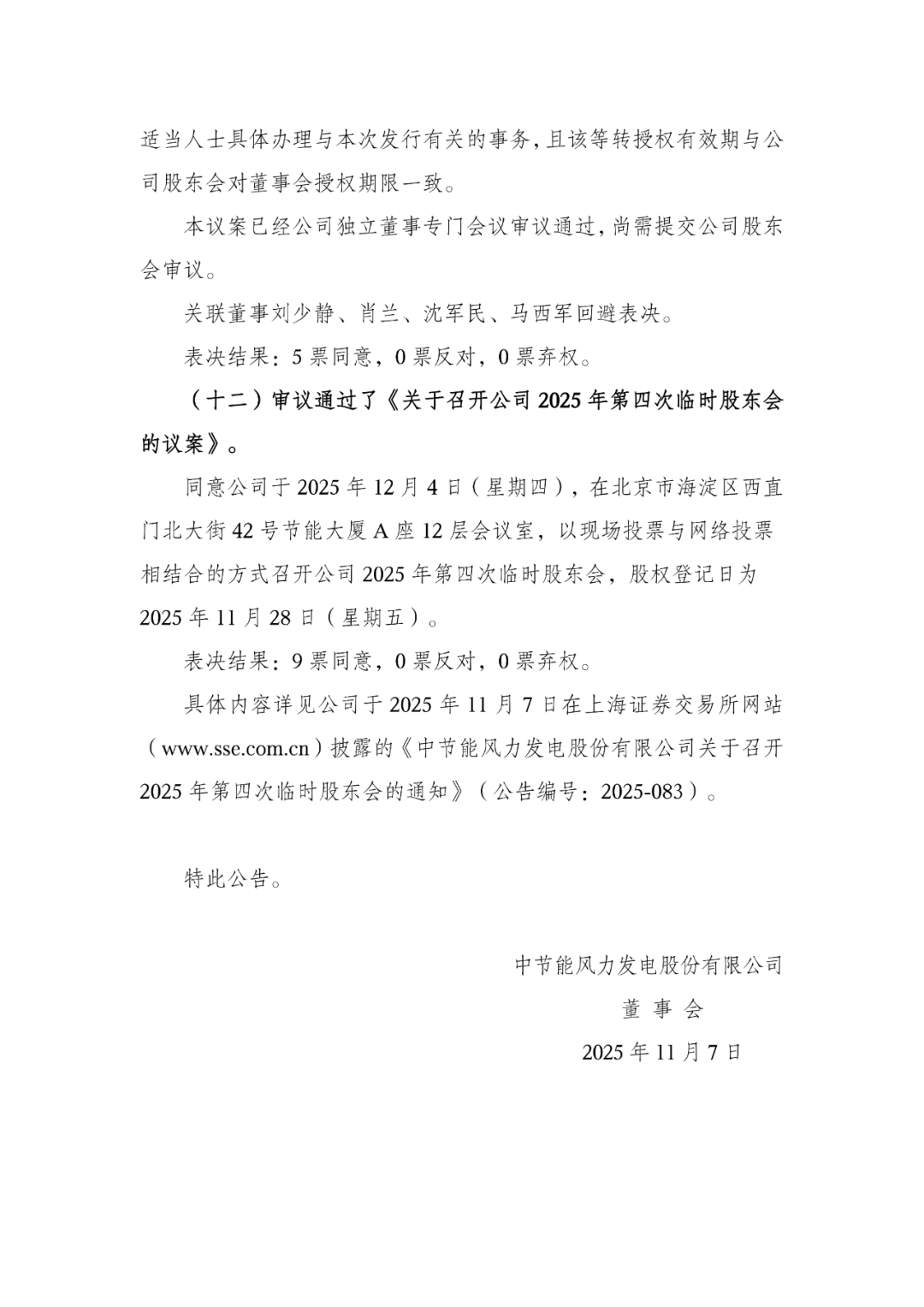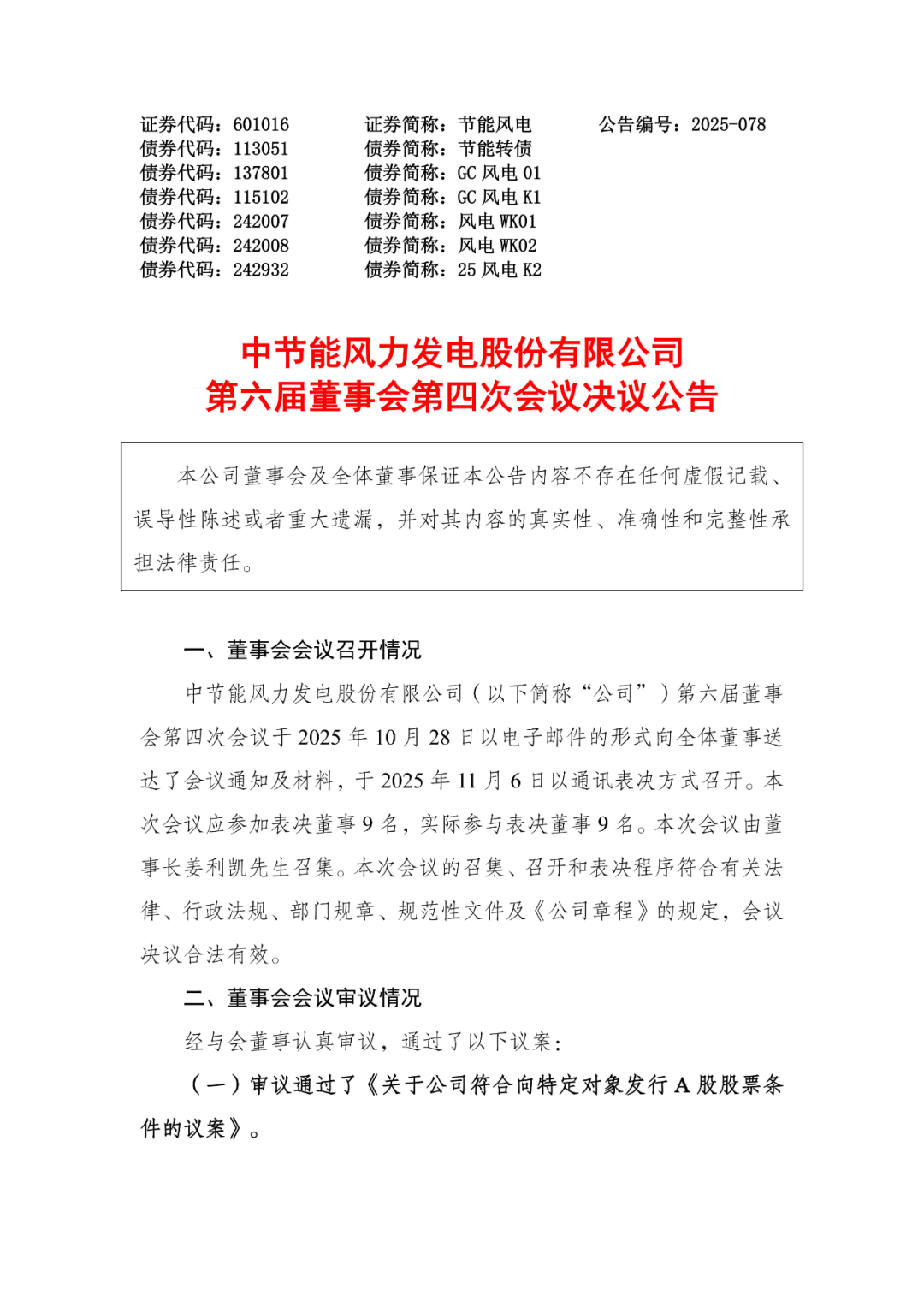 风芒能源获悉,11月7日,中节能风力发电股份有限公司(简称:节能风电)发布第六届董事会第四次会议决议公告。