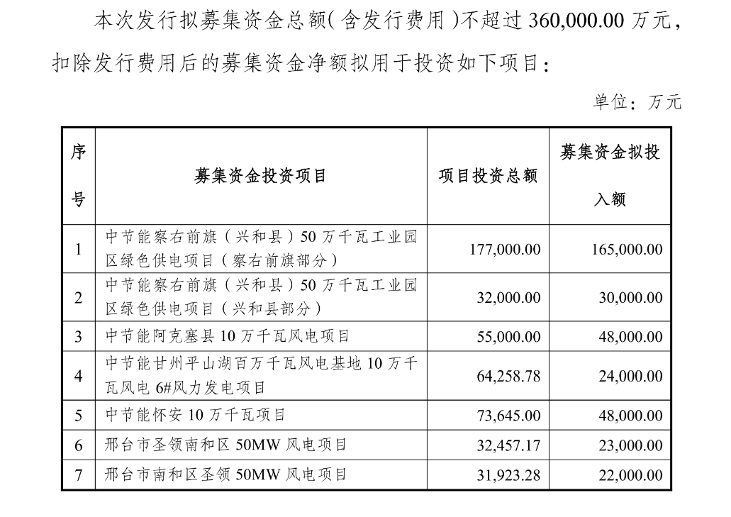 本次发行拟募集资金总额(含发行费用)不超过360,000万元,扣除发行费用后的募集资金净额拟用于投资7个风电项目,总规模为900MW。