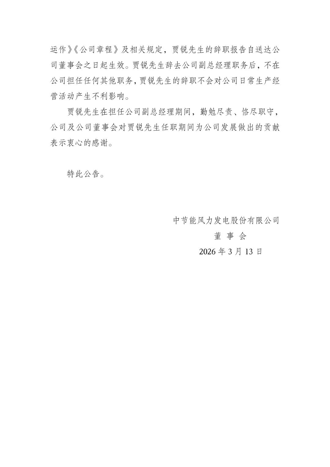 风芒能源获悉,3月13日,中节能风力发电股份有限公司(以下简称“节能风电”)发布《关于公司高级管理人员离任的公告》。