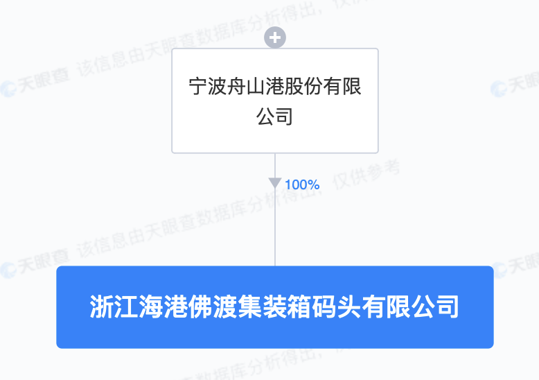 天眼查APP显示,近日,浙江海港佛渡集装箱码头有限公司成立,法定代表人为韩路,注册资本5000万元,经营范围包含:船舶港口服务;港口货物装卸搬运活动;港口经营等。天眼查股权穿透显示,该公司由宁波港100%控股。