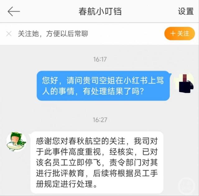 ▲春秋航空微博客服表示该空姐已被停飞。随后,记者通过电话联系了春秋航空客服。一名工作人员表示:“感谢您对我们春秋航空的关注,您提出的这个问题,稍后会有我们新闻发言人进行回复。”19日下午,微博认证为“春秋航空公司客服官方微博”的“春秋小叮铛”通过私信回应记者称:“感谢您对春秋航空的关注,我司对于此事件高度重视,经核实,已对该名员工立即停飞,责令部门对其进行批评教育,后续将根据员工手册规定进行处理。”