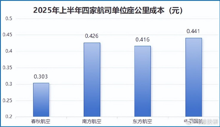 2025年上半年,春秋航空的单位座公里成本更是同比下降3.5%,达到0.303元。而同期中国国航、东方航空和南方航空三大航的单位座公里成本均超过0.41元。