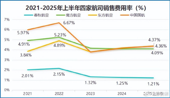 反映在数据上:春秋航空的销售费用率常年维持在1.5%左右,而三大航的销售费用率普遍在4%以上,差距一下就拉开了。