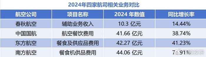2024年春秋航空辅助业务实现收入10.3亿元,同比增长14.44%,占营业收入的5.15%。而同期中国国航、东方航空和南方航空仅餐食费用就都超过了40亿元。