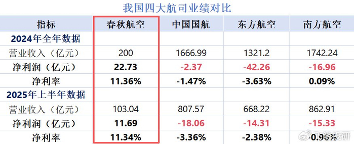 2025年上半年,中国国航、东方航空、南方航空三大航合计营收超过2300亿,却集体亏损超47亿。反观春秋航空,不仅净赚11.69亿,净利率还超过了11%。