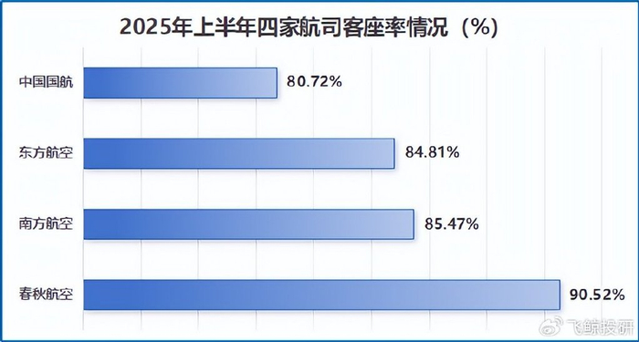 由于低价优势,春秋航空自然能吸引更多旅客,客座率常年保持领先。2025年上半年,其平均客座率达90.52%,高于同期的中国国航、东方航空和南方航空。
