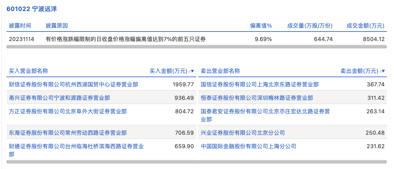 11月14日,宁波远洋今日涨停,全天换手率达4.93%,振幅达0%。龙虎榜数据显示,营业部席位合计净买入3643.08万元。其中,财信证券杭州西湖国贸中心证券营业部、甬兴证券有限公司宁波和源路证券营业部分别买入1959.77万元、936.49万元;国信证券上海北京东路证券营业部、恒泰证券深圳梅林路证券营业部分别卖出367.74万元、311.42万元。