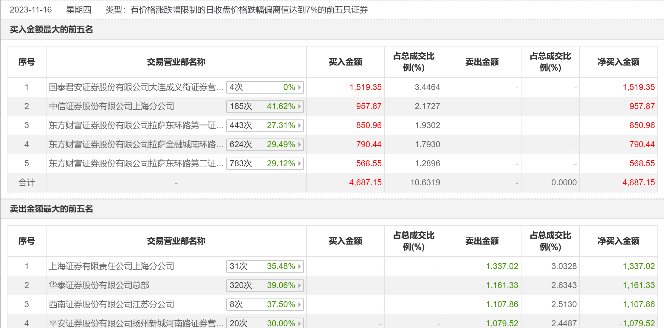 具体来看,上海证券上海分公司、华泰证券总部分别卖出1337.02万元、1161.33万元;国泰君安证券大连成义街证券营业部、中信证券上海分公司分别买入1519.35万元、957.87万元。