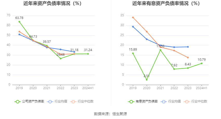 在偿债能力方面,公司2024年上半年末资产负债率为31.24%,相比上年末上升0.06个百分点;有息资产负债率为10.79%,相比上年末上升2.36个百分点。