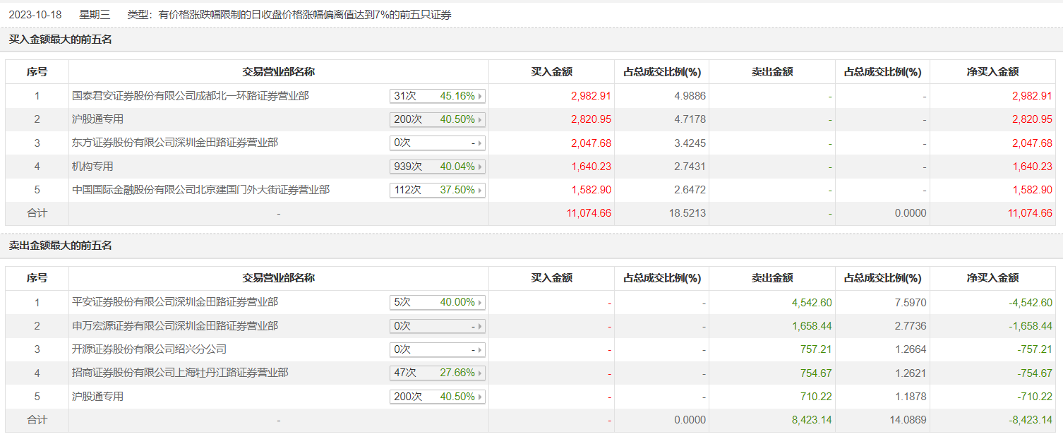 玉龙股份10月18日涨停,全天换手率达7.12%,振幅达9.33%。龙虎榜数据显示,营业部席位合计净买入2651.53万元。其中,机构合计净买入1640.23万元。此外,国泰君安证券成都北一环路证券营业部、沪股通专用分别买入2982.91万元、2820.95万元;平安证券深圳金田路证券营业部、申万宏源证券有限公司深圳金田路证券营业部分别卖出4542.60万元、1658.44万元。