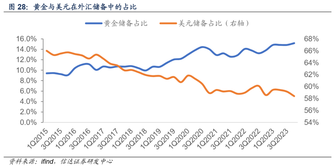 美元在全球外汇储蓄中的占比降低。黄金的货币属性对应黄金对美元体系的替代性,近年来,美国财政赤字和债务水平过高,美元的信用和价值或受到冲击。截至2023年年底,美元占全球公开官方外汇储备的59.17%,美元份额的下降已经被多种其他货币所取代,截至2023年底,黄金在全球外汇储备占比达到15.2%。