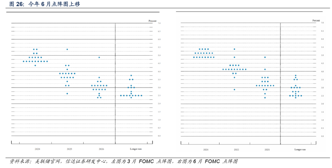 与3月点阵图相比,6月点阵图显示降息次数从3次缩减为1-2次。点阵图显示近八成的官员预计今年至少降息一次,而预计今年不降息的票委增加至四位。与之相对应的是,6月美联储的SEP上调了今年的联邦基金利率中枢,从3月的4.6%上调至5.1%。