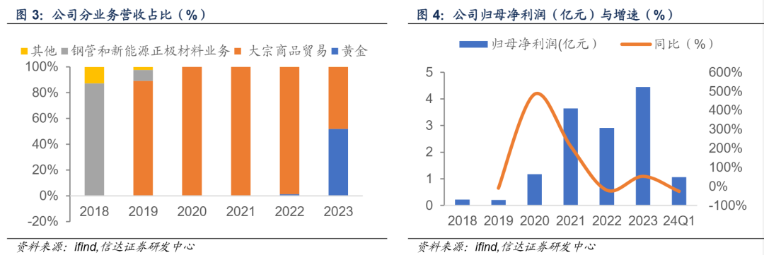 公司大股东变更为济高资本,实际控制人为济南高新区管理委员会。自2021年国企控股后,公司主营业务从钢管转型为矿业+贸易业务,公司依托集团资源,收购优质黄金与新能源矿业资产,并在2024年坚定出清大宗贸易业务,持续推进黄金矿山资源增效增储,加大优质矿产资源的找矿力度。目前公司黄金业务贡献主要业绩,2023年黄金业务营收占比52%,毛利占比67%。2024Q1公司实现归母净利润1.06亿元,同降26%,其中黄金实现净利润1.31亿元,同涨28%。