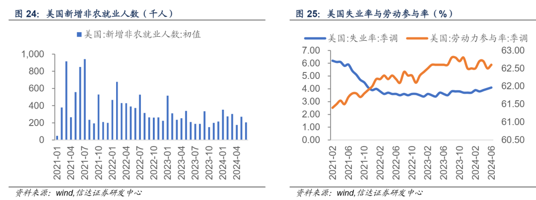 美国劳动力市场强劲,通胀放缓。2024年6月美国CPI同比上涨3.0%,低于前值的3.3%;6月核心CPI同比上涨3.3%,低于前值的3.4%,通胀重新放缓。根据信达证券研发中心宏观团队观点,能源价格上涨是通胀水平边际反弹的主要贡献,但住房租金通胀有望回落。6月美国ISM制造业PMI为48.5,低于前值,均回落到50下方。6月非农就业人数为20.6万人,高于预期的19.0万人,低于前值的27.2万人。6月失业率小幅反弹至4.1%,较5月失业率略有上升。