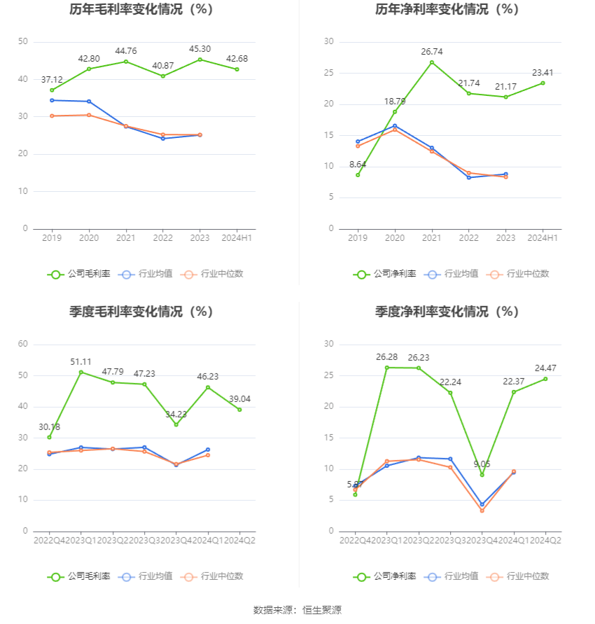 2024年上半年,公司毛利率为42.68%,同比下降6.76个百分点;净利率为23.41%,较上年同期下降2.85个百分点。从单季度指标来看,2024年第二季度公司毛利率为39.04%,同比下降8.75个百分点,环比下降7.19个百分点;净利率为24.47%,较上年同期下降1.76个百分点,较上一季度上升2.10个百分点。