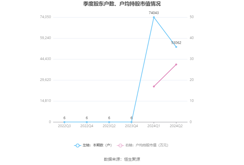 筹码集中度方面,截至2024年上半年末,公司股东总户数为5.31万户,较一季度末下降了2.1万户,降幅28.34%;户均持股市值由一季度末的16.96万元上升至27.46万元,增幅为61.91%。