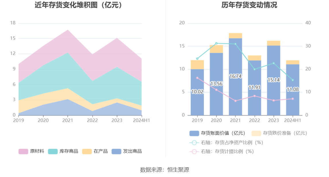 从存货变动来看,截至2024年上半年末,公司存货账面价值为11.08亿元,占净资产的15.3%,较上年末减少4.07亿元。其中,存货跌价准备为8585.08万元,计提比例为7.19%。
