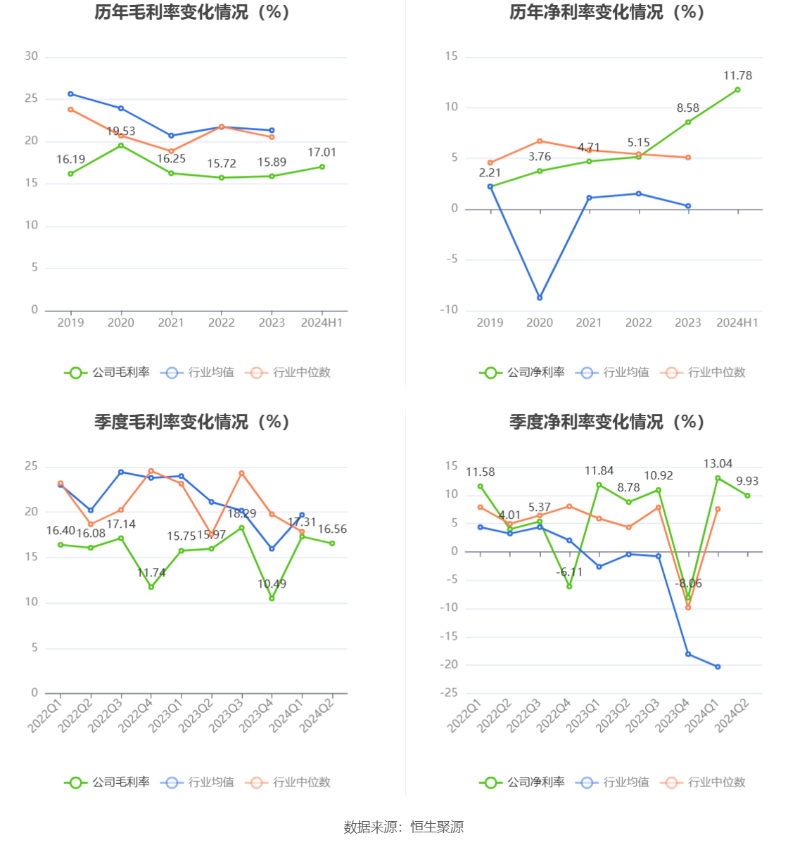 2024年上半年,公司毛利率为17.01%,同比上升1.16个百分点;净利率为11.78%,较上年同期上升1.23个百分点。从单季度指标来看,2024年第二季度公司毛利率为16.56%,同比上升0.59个百分点,环比下降0.75个百分点;净利率为9.93%,较上年同期上升1.15个百分点,较上一季度下降3.11个百分点。