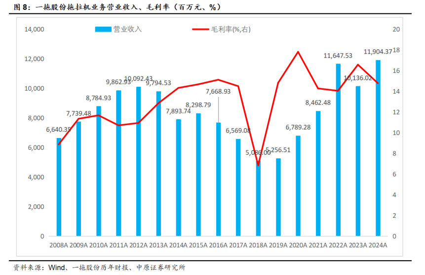 公司是国内拖拉机龙头企业,受益国家粮食安全、农机设备更新、购置补贴优机优补倾斜等政策,拖拉机大型化、高端化趋势明显,公司拖拉机市场份额有望进一步提升。同时,公司通过积极研发持续提升产品竞争力,拓宽出口空间。我们预测公司2025年-2027年营业收入为132.74亿、145.27亿、156.34亿,归母净利润分别为10.26亿、11.85亿、13.07亿,对应的PE分别为15.12X、13.1X、11.87X,维持公司“买入”评级。