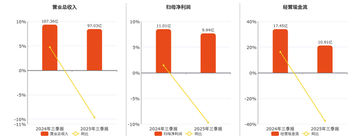 公司营业总收入为97.03亿元,在已披露的同业公司中排名第5,较去年同报告期营业总收入减少10.34亿元,同比较去年同期下降9.63%。归母净利润为9.94亿元,在已披露的同业公司中排名第4,较去年同报告期归母净利润减少1.07亿元,同比较去年同期下降9.69%。经营活动现金净流入为10.91亿元,在已披露的同业公司中排名第2,较去年同报告期经营活动现金净流入减少6.54亿元,同比较去年同期下降37.48%。