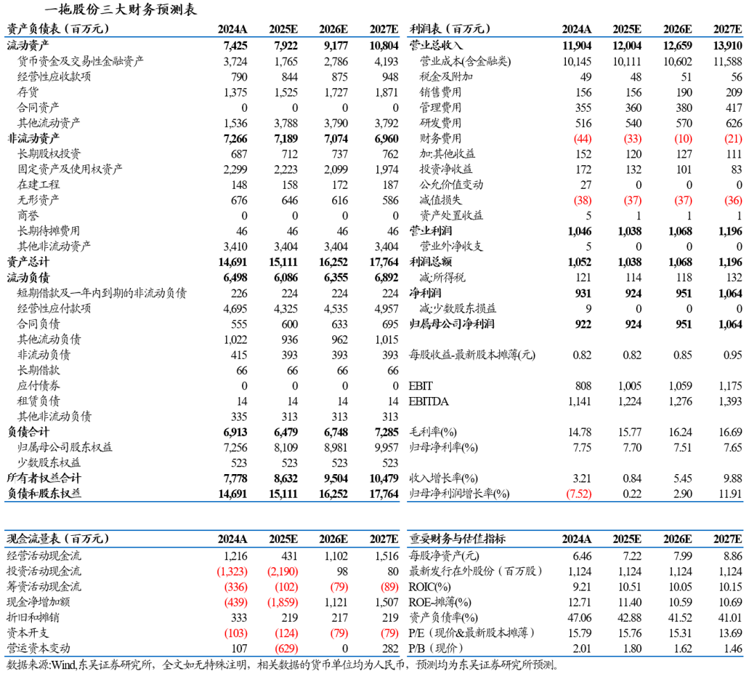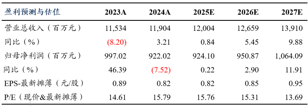 我们维持公司2025-2027年归母净利润预测为9.2/9.5/10.6亿元,当前市值对应PE分别为16/15/14倍,维持“买入”评级。