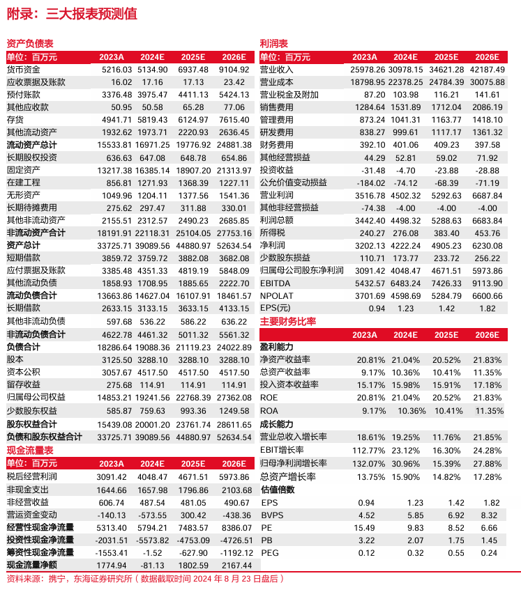 投资建议:我们预测2024年-2026年公司EPS分别为1.23元、1.42元和1.82元。对应PE(以2024年8月23日收盘价计算)分别为9.83倍、8.52倍和6.66倍。我们看好公司海外产能扩张带来的业绩增量以及高研发支撑下的品牌力提升,维持“买入”评级。
