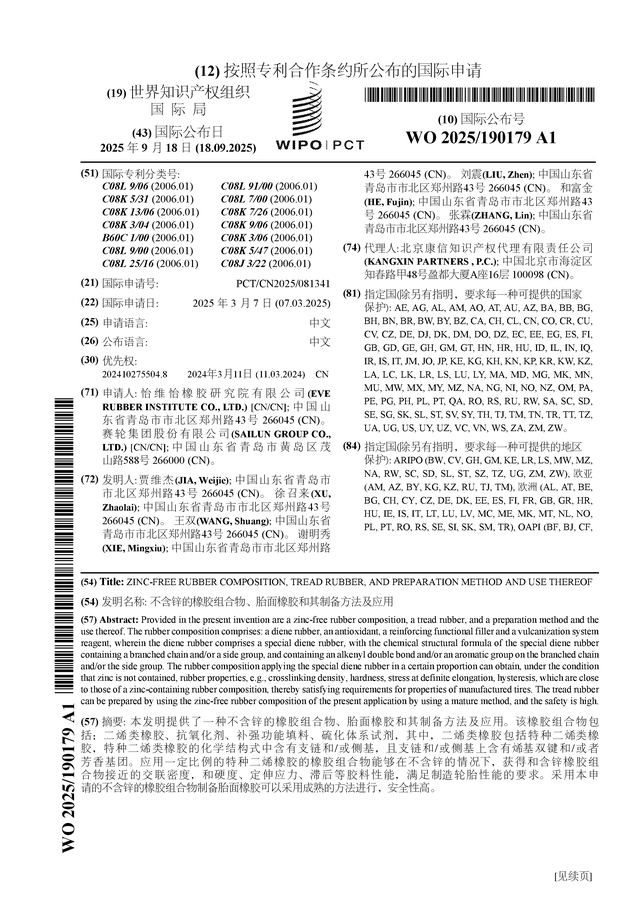 赛轮轮胎公布国际专利申请:“不含锌的橡胶组合物、胎面橡胶和其制备方法及应用”